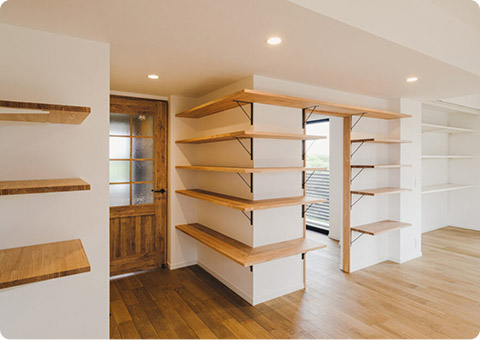 趣味のサーフィン道具も気にせず置ける、広い土間を玄関に設けました。現在ベッドルームになっている大きな部屋は、将来部屋を区切れるような工夫も。家族団らんの中心となるLDKは、無垢フローリングをふんだんに敷き詰めた床にたっぷりと陽の光が注ぎ、日中は自然光のみでもOK。色味にこだわったアクセントクロスやタイルもポイントです。
